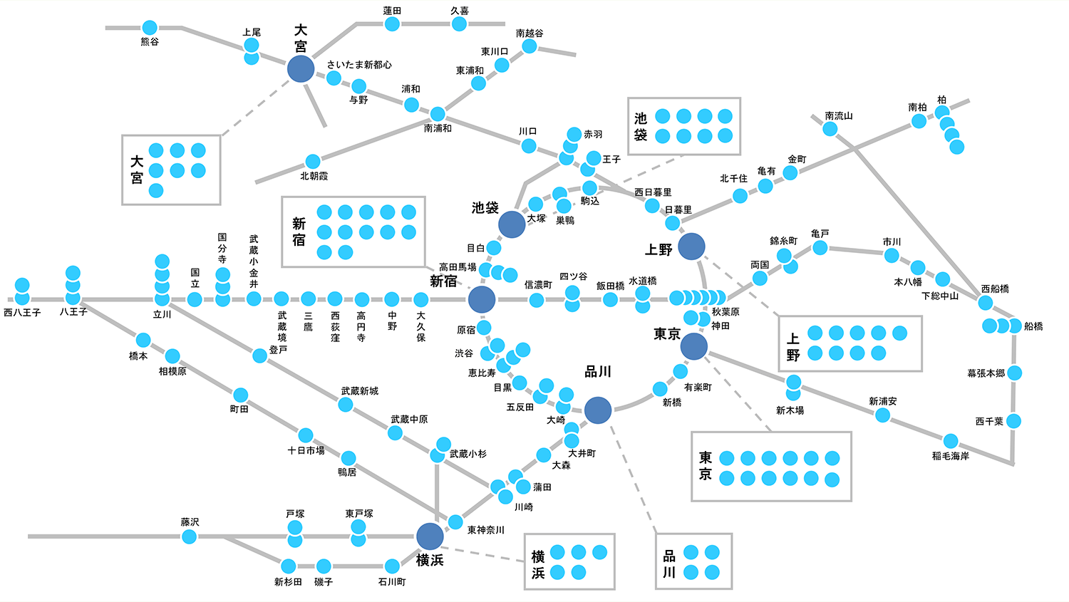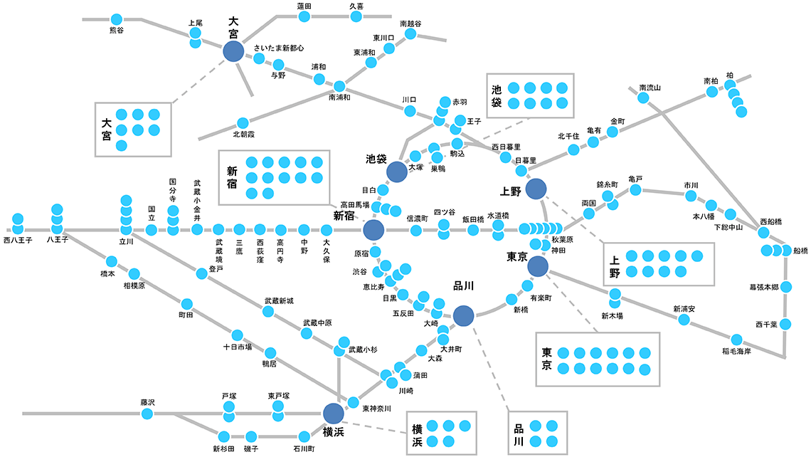 東京圏内※での広域設置と主要ターミナル駅への複数台設置で駅を行き交う多くのお客さまへリーチします。