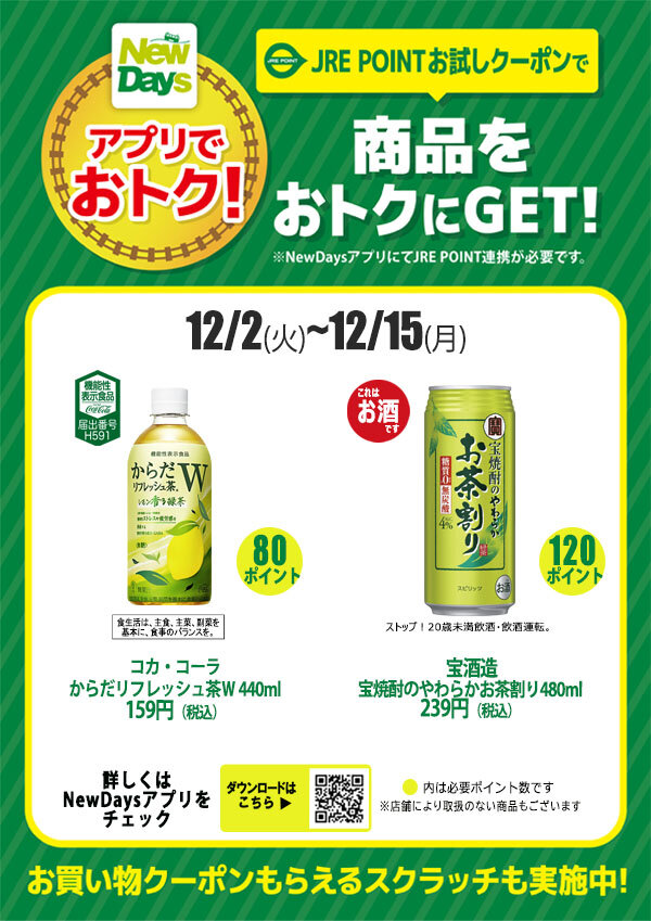 ※JRE POINTお試しクーポンを使用する場合は、NewDaysアプリのアップデートとJRE POINT連携が必要です