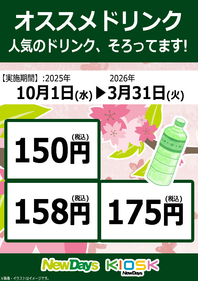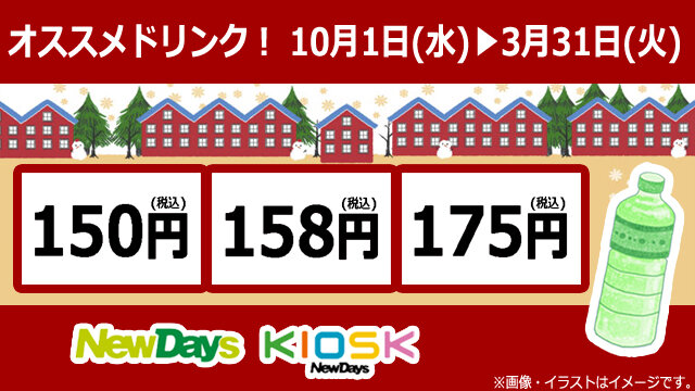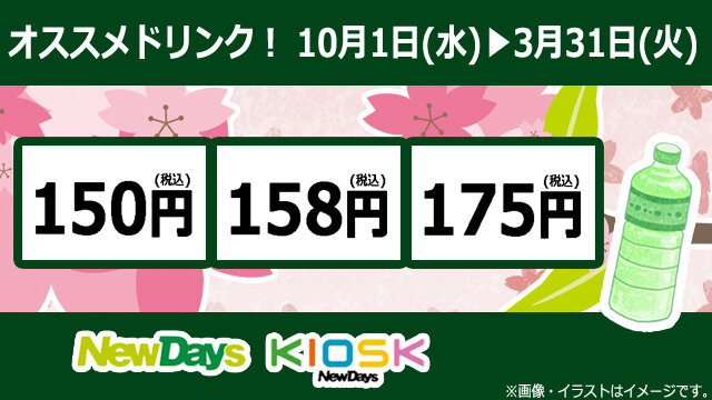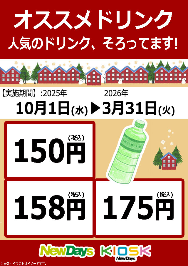 2025年10月1日(水)~2026年3月31日(火)の期間中、対象の飲料の取扱いがあるNewDays・NewDays KIOSKでは、「人気のオススメドリンク 対象の飲料が150円!158円!175円!」を実施いたします。
