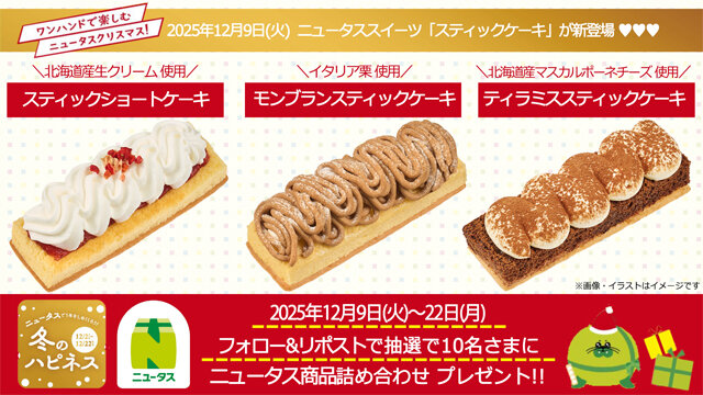 2025年12月9日(火)X告知後~12月22日(月)の期間中、NewDays公式Xアカウント(@newdays_jp)をフォローして、対象のポストをリポストしていただいた方の中から抽選で10名様に「ニュータス商品詰め合わせ」をプレゼントいたします。