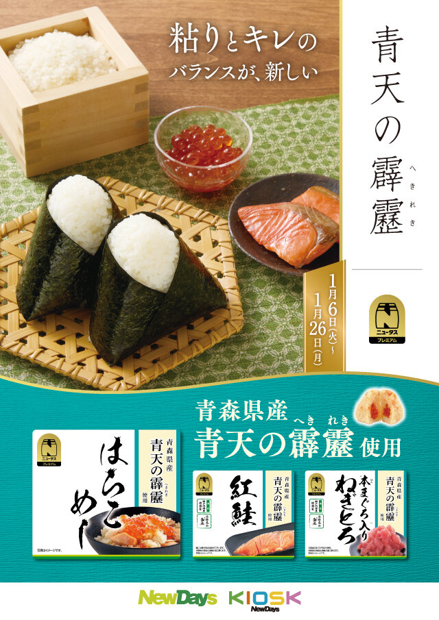 期間中、NewDays・NewDays KIOSKでは、青森県産米「青天の霹靂」を使用したおにぎりを期間限定で販売いたします。