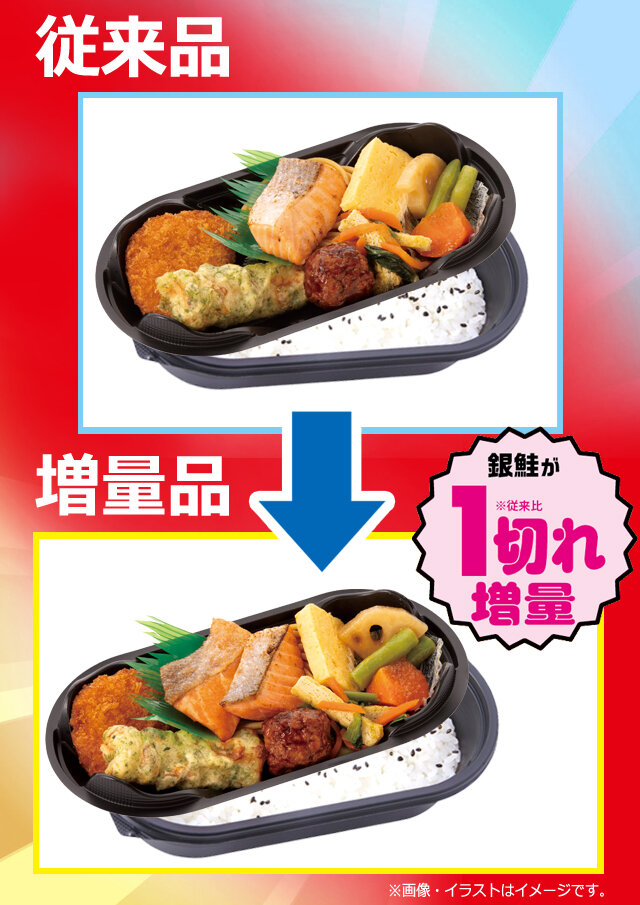 ①期間中、NewDays・NewDays KIOSKでは、対象商品が従来の商品に比べて具材や重量等を増量(※従来比)して発売いたします。