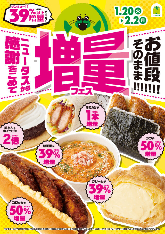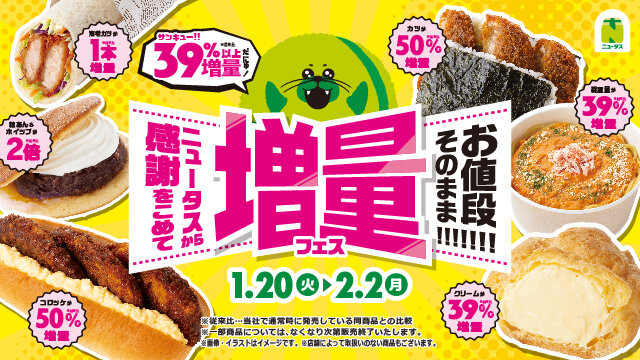 2026年1月20日(火)~2月2日(月)の期間中、NewDays・NewDays KIOSKでは、対象商品がお値段そのままで従来の商品に比べて具材や重量等を増量(※従来比)して発売するキャンペーンを実施いたします。