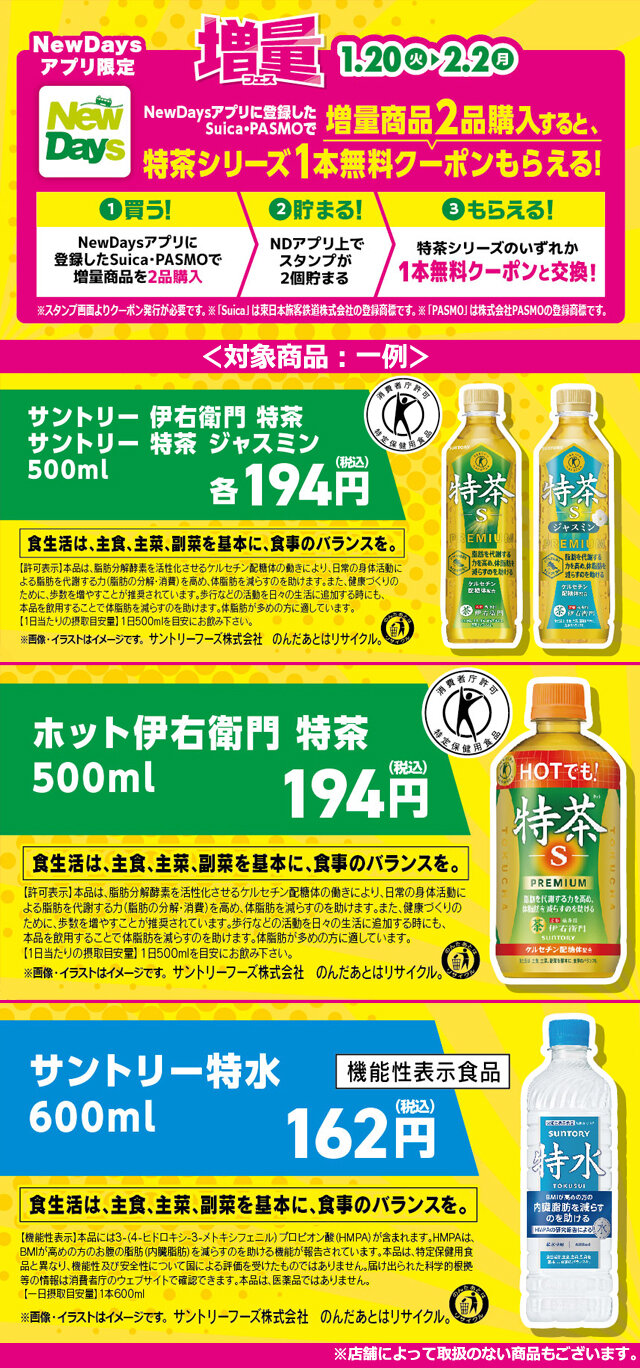 ②期間中、事前にNewDaysアプリに登録したSuica・PASMOで増量商品を2品購入すると、特茶シリーズ1本無料クーポンをプレゼントいたします。