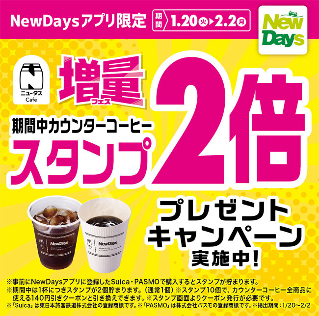 ③期間中、事前にNewDaysアプリに登録したSuica・PASMOでカウンターコーヒーを1杯購入すると、アプリ内で貯まるスタンプを2個(通常時の2倍)プレゼントいたします。