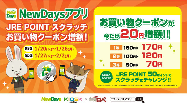 期間中、NewDaysアプリでは「JRE POINTスクラッチ」でもらえるお買い物クーポンが、各賞20円増額になります。
