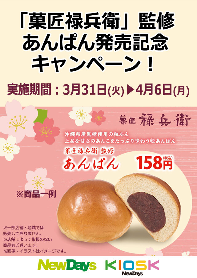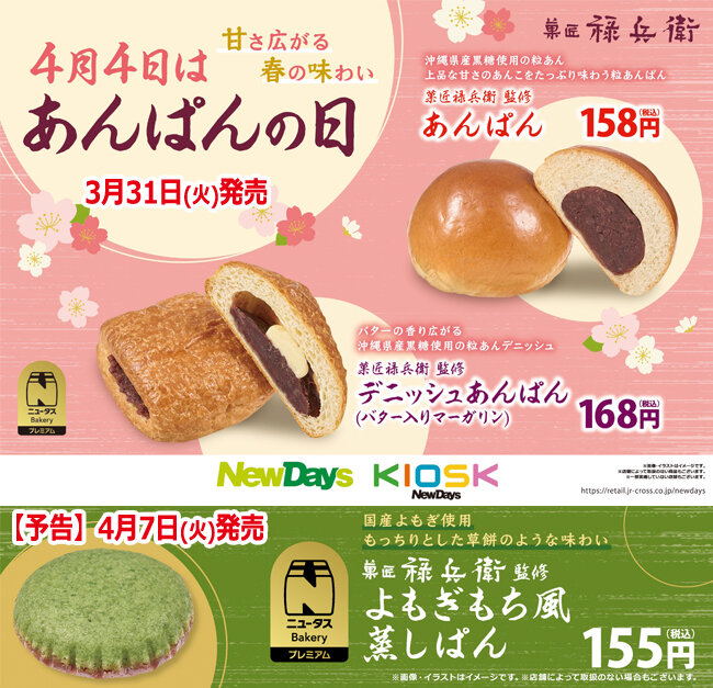 ①NewDays・NewDays KIOSKでは、和菓子店「菓匠禄兵衛」が監修したあんぱんを数量限定で販売いたします。
