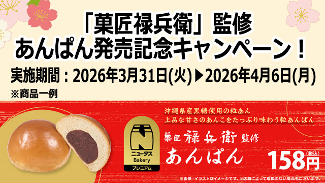 NewDays・NewDays KIOSK・KIOSKでは、2026年3月31日(火)から期間限定で、人気和菓子店「菓匠禄兵衛」が監修したあんぱんを、昨年誕生したオリジナル商品ブランド「ニュータス」から数量限定で発売いたします。