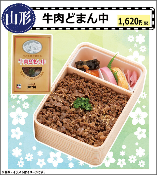 山形県産米「どまんなか」をふっくら炊き上げ、その上に特製のタレで味付けした牛そぼろと、牛肉煮をのせた牛丼風のお弁当です。