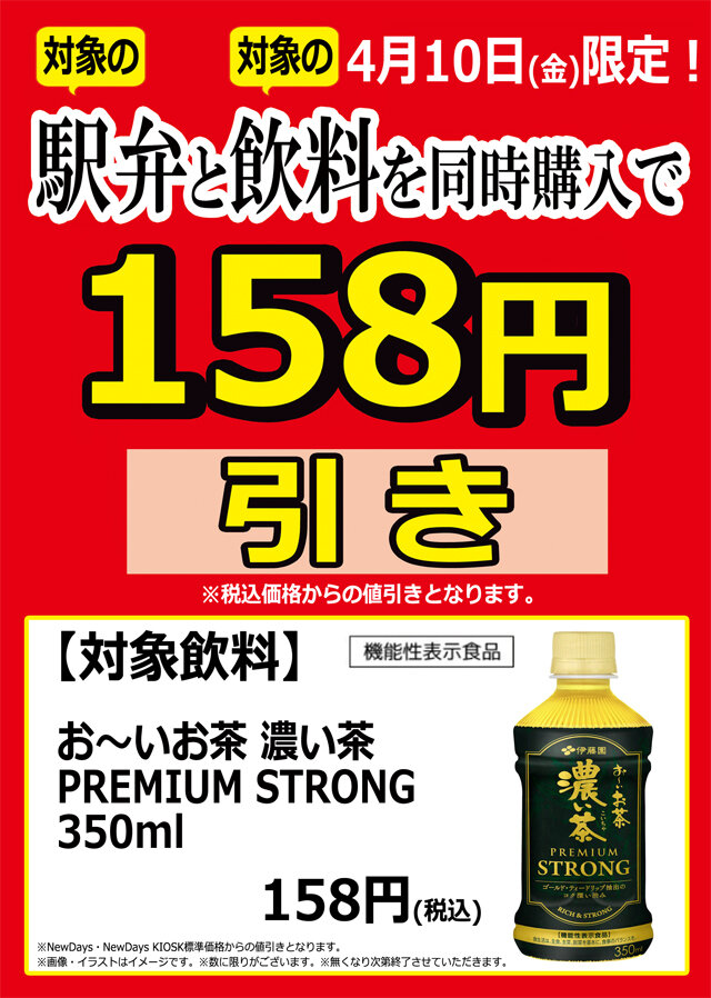 4月10日(金)限定で、対象の駅弁いずれか1品と、対象の飲料を1品、合計2品を同時に購入すると、158円引きになります。