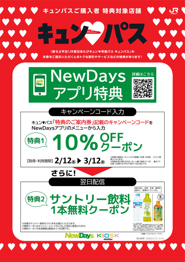 NewDaysアプリでは、2026年2月12日(木)~3月12日(木)の期間中「旅せよ平日!JR東日本たびキュン♥早得パス キュンパス」のご購入特典として、NewDays・NewDays KIOSKでご利用いただける10%OFFクーポンをプレゼントしております。