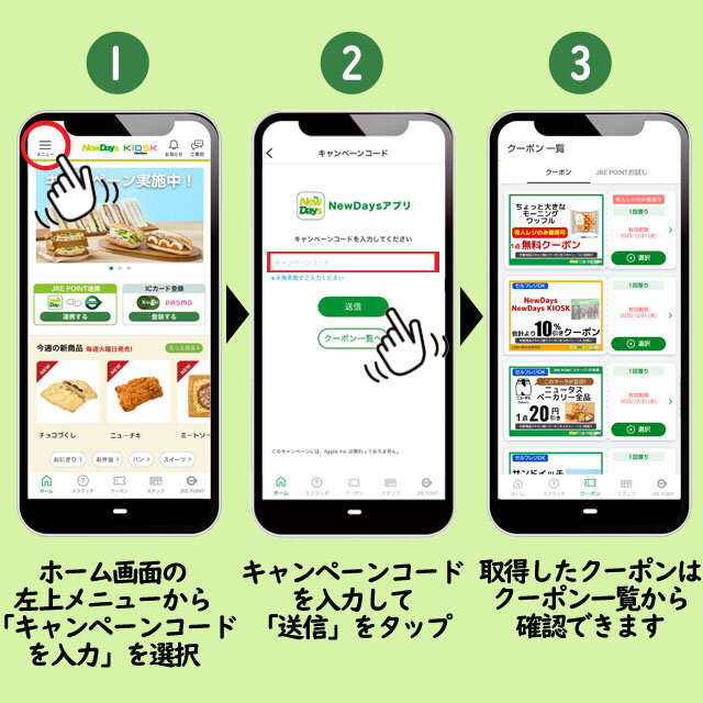 ・クーポン取得可能期間中に、NewDaysアプリにキャンペーンコードを入力